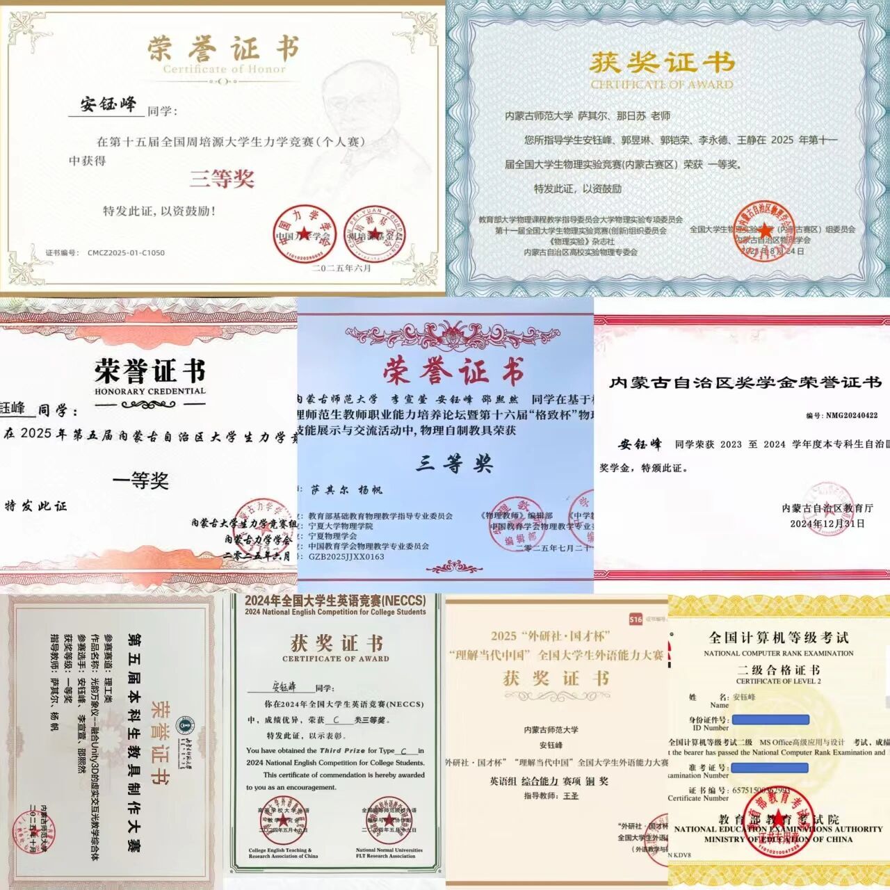 2023级物理学三班的安钰峰,目前担任学院党员服务站站长和班级生活委员。在学习方面,我始终以勤勉专注的态度对待每一门课程,连续两年分别以90.73和92.77分位列专业第一。同时,我积极参与各类学科竞赛,并均已500+通过大学英语四六级考试,目前正参与基于Unity3D的虚拟仿真实验教学项目,致力于通过技术手段助力偏远地区物理实验教学;思想方面,我积极向党组织靠拢,同时通过参与青年大学习等活动,不断夯实理想信念;社会实践方面,我积极参与志愿服务,如迎新、社区清洁等活动,志愿北疆累计时长达142.6小时,到梦空间积分累计达493分。获国家奖学金后,我将继续深耕专业、服务社会,努力成为新时代优秀青年。