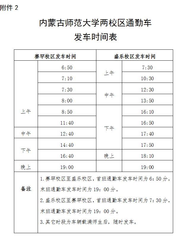 2.两校区发车时间: 赛罕校区早始发车时间为6:50;末班车发车时间为19:00。 盛乐校区早始发车时间为7:30;末班车发车时间为19:00。其他通勤车发车时间安排详见附件2:熟女直播