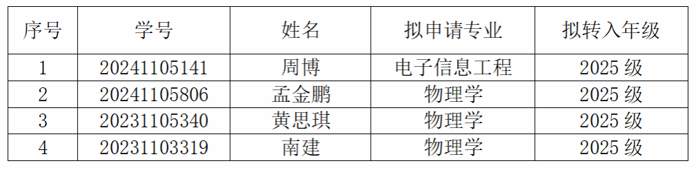 2025年4月25日,学院对拟转专业学生进行了笔试、面试。现将拟接收转专业的学生名单公示如下: