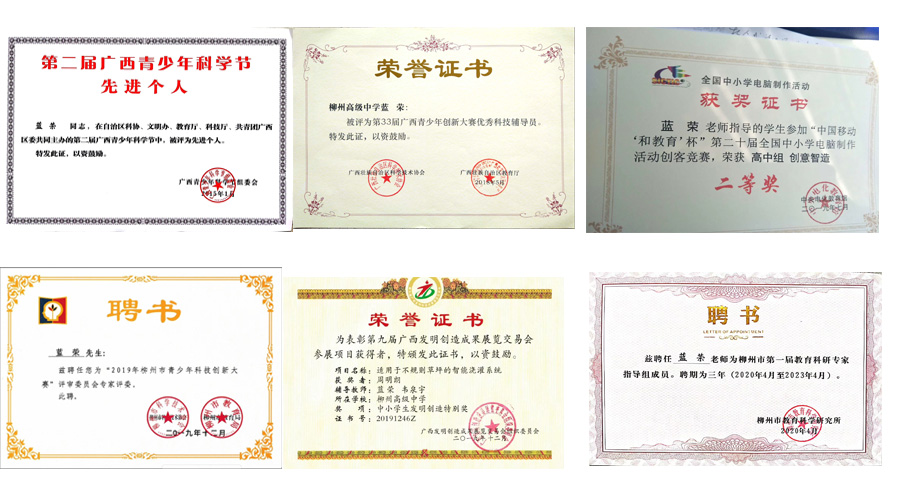 身为学校通用技术组教研组组长,同时还是学校兼职科技辅导员蓝荣一直在不断追求着自我价值的最大化。为了让更多的学生受到科技的熏陶,他组建了柳州高中科技教育教师团队,倡导成立了柳州高级中学创客空间,为学生的创新活动搭建基础平台。多年来,蓝荣坚持每年从高一新生中选拔一批科技爱好者参加学校科技社团活动。保持每周开放实验室,给学生免费开设创新课程,启发学生的创新思维,并在课余时间辅导编程知识和加工技术,提升他们的实践能力。在他的带动下,学生们对发明创新产生了浓厚的兴趣。在辅导学生开展科技创新的同时,他不断认真总结经验,编纂成册,形成了一套完善的科技创新育人体系,在此基础上研发了一套适合高中生使用的创客课程和实验室管理体系。2016年组织开展柳州市软课题《创客背景下小学创客教材编撰研究》科研项目,并顺利结题。研发了基于scratch的测控板并在在柳州市中小学推广编程教育,收益学生人数达1800人。基于他在创新教育领域的影响,2016年至2018年连续三年受邀成为广西壮族自治区科技辅导员创客论坛主讲嘉宾,为全省的科技辅导员授课,广受好评。