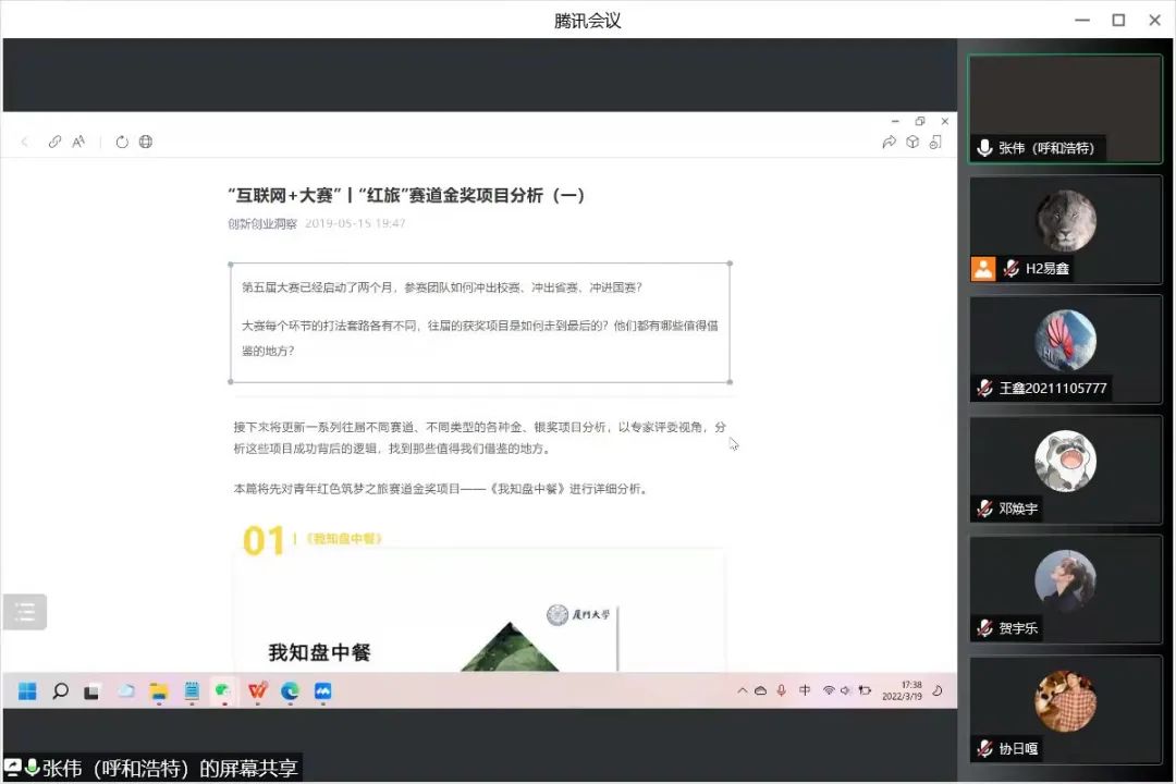 会上,同学们围绕 “青年红色筑梦之旅”赛道参赛要求,深入交流了关于项目改进创新的新想法、新思路,深刻反思了项目存在的短板、问题和不足之处,共同制定了下一阶段的任务目标。张伟老师指出:要想取得优异成绩就要育好项目种子、选好项目组别、学好评审要点、炼好项目内功、写好项目资料、做好路演答辩。我们当前已经选好了项目负责人,组建好项目团队,接下来的任务重心就是提早完成相关材料的准备,做好初期的项目构建。