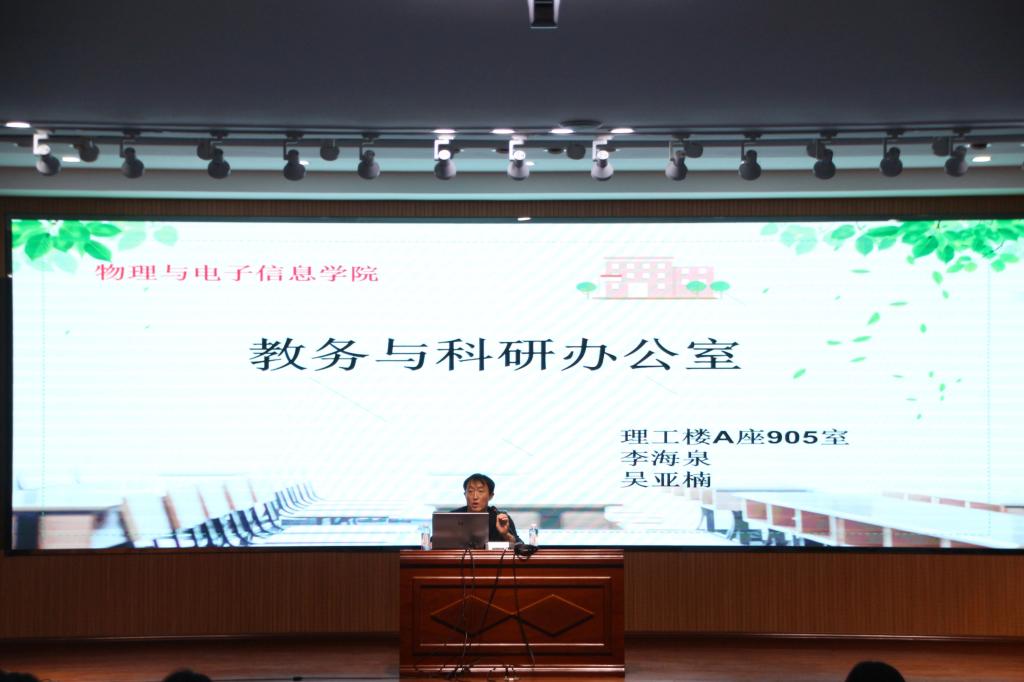 教务办主任李海泉老师作本科教务管理相关工作专题讲座。李老师从培养方案、学籍管理、学生证办理、申请转专业、选课、学业过程监测、学业预警、毕业审核与学位审核、加盖公章、各类考试九个方面为同学们进行“学业导航”