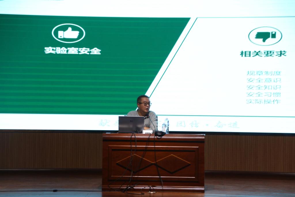 实验室,讲解了实验室安全管理制度,让同学们了解标准操作流程,危废处理,实验室安全检查,应急响应和泄漏处理方法。他叮嘱新生要提高安全防范意识。