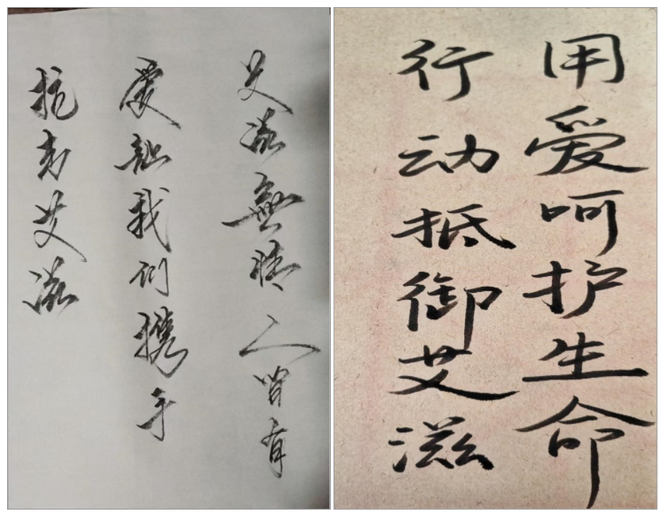 同学们踊跃参与,征集到的作品以书法居多。各位同学的作品笔画流畅自如,字体优美动人,既有传统的行书,楷书,又有各种新颖形式,表现出书法艺术的独特魅力。这些作品不仅在艺术上具有创新和表现力,而且在社会教育和文化传达上也发挥了重要作用,提高了公众对艾滋病的认识,促进了对患者的理解和支持。