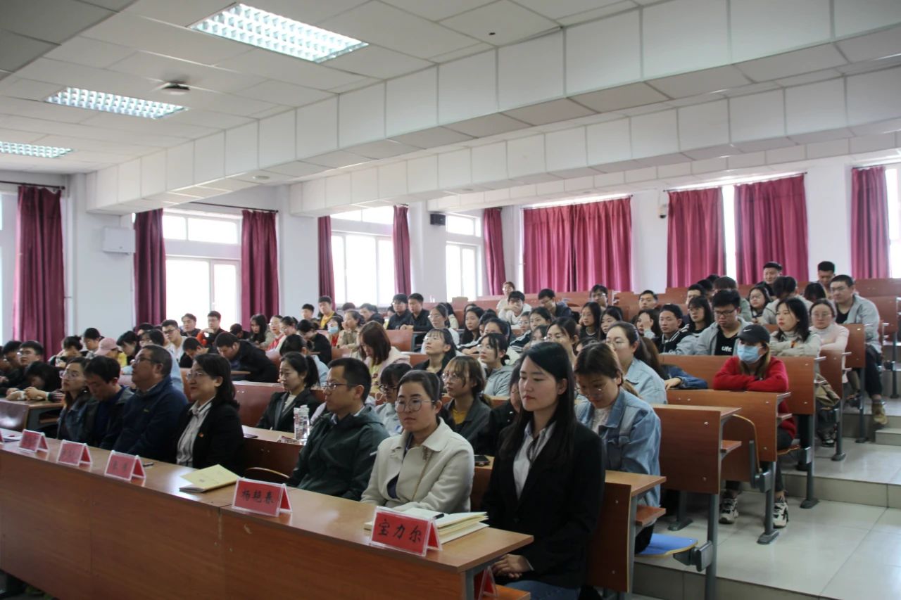 于4月28日下午在行知楼323教室召开毕业生大会。学院党委书记刘美玲、副书记兼副院长张伟,教务办主任李海泉,17级物理学蒙班班主任木其尔、17级物理学汉班班主任张天臣、17级电子信息工程1班、2班班主任那日苏、17级材料物理班班主任杨艳春,团总支副书记宝力尔、辅导员宋鑫伟参加会议,会议由学就办副主任王乐主持。