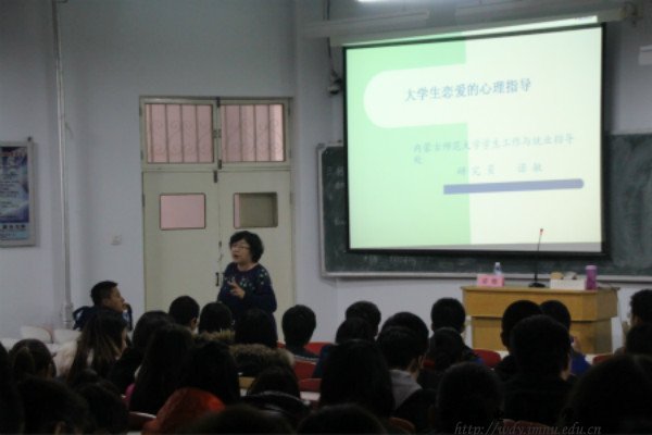 特邀老干部协会的诺敏教授为大一新生召开了当代大学生的恋爱心理指导讲座。讲座中诺敏老师以自己丰富的人生经验和幽默风趣的语言为同学们深入的讲解了如何树立正确的恋爱价值观和处理恋爱问题的正确措施。同时以台上台下互动交流的方式让同学们放松心情并全身心地投入到讲座的倾听中去。她还用身边的实例来激励同学们去努力学习,并教同学们如何合理安排大学中的学习生活娱乐等时间。通过本次有风趣有意义的讲座,使同学们更加懂得如何去对待懵懂的情感,去理性的规划自己的大学以及今后的人生之路。