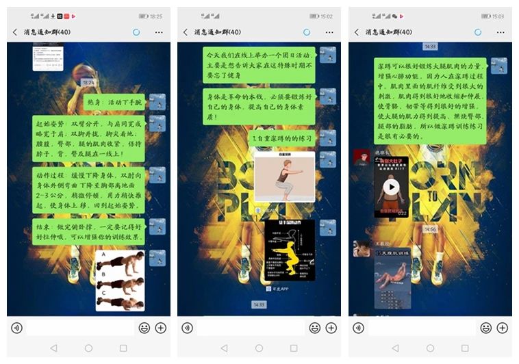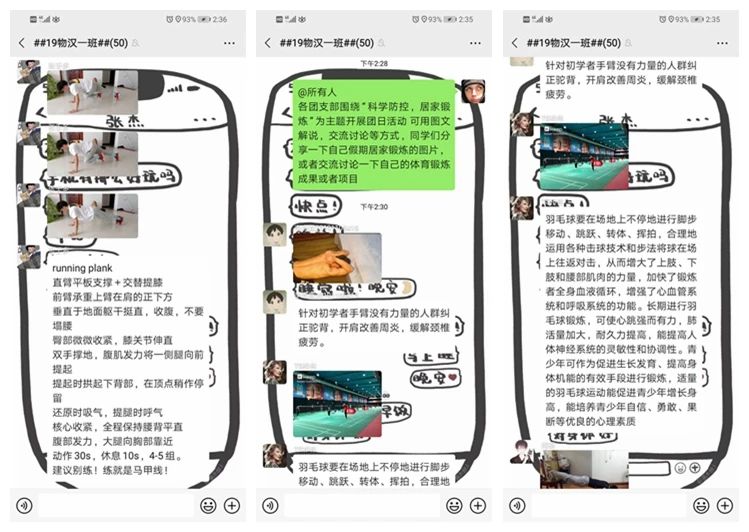 内各团支部围绕“科学防控,居家锻炼”为主题组织开展团日活动,呼吁同学们进行居家体育锻炼。