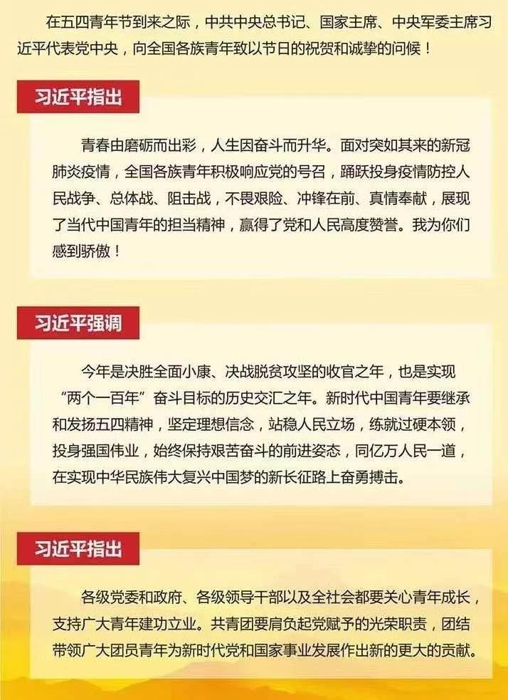 对于习近平总书记的发言,我们感受到整个民族,整个国家对于我们的隐隐期盼,声声嘱托,百年前的先人,用自己的汗水,换来了祖国的自立自强,而百年后的我们,亦勇于奋进,精益求精,用行动实现美丽中国,用青年精神再创祖国辉煌!