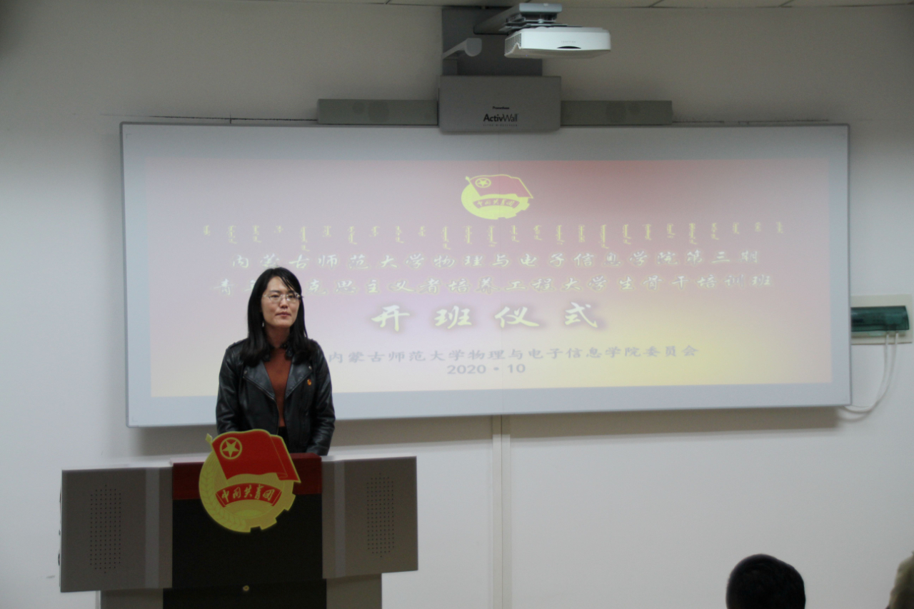 开班仪式上,宝力尔老师介绍了举办青马班的意义、本期青马班的培训纪律及日程。王乐老师就学生干部应具备的品质提出了具体要求,嘱咐大家作为学生的表率应乐于奉献、坚韧不拔。宋鑫伟老师讲述了自己对青马班的认识和理解,分享了曾经作为青马班学员的学习经历。培训学员代表海兰作了表态发言,她表示,青马班是同学们锻炼品格意志、提高工作水平和思想觉悟的大课堂,作为青马班的一员,在今后的学习工作中会更加努力,严于律己,发挥学生干部的模范作用。