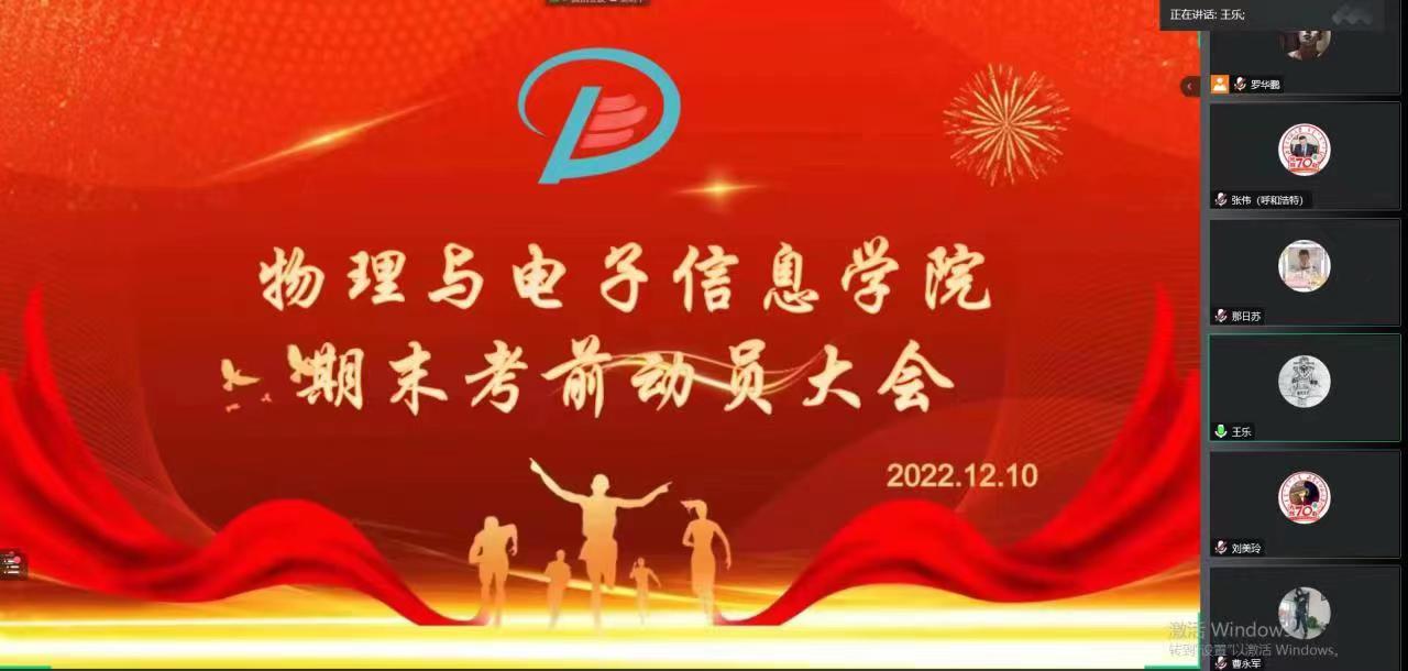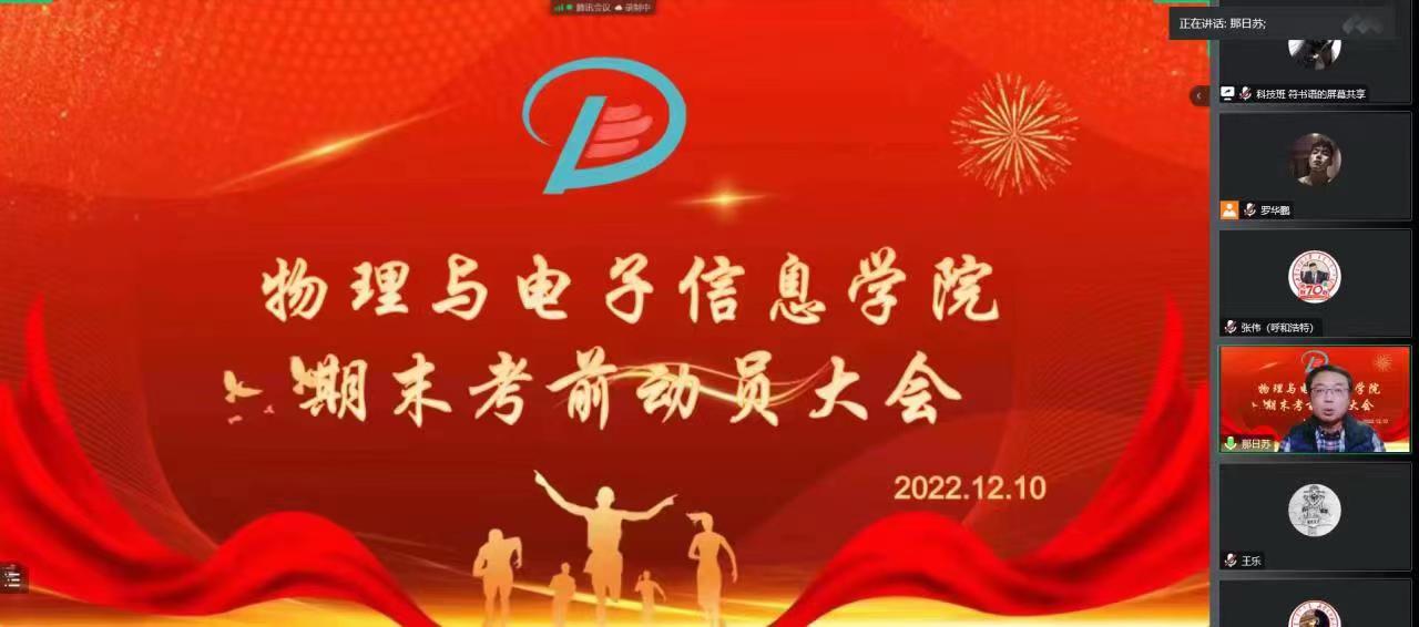 于2022年12月10日晚19:00,线上召开考前动员大会。党委书记刘美玲、院长曹永军、党委副书记、副院长张伟、副院长那日苏、团总支、学就办、2022级本科生、研究生班主任及全体学生参加。会议由学就办副主任王乐主持。