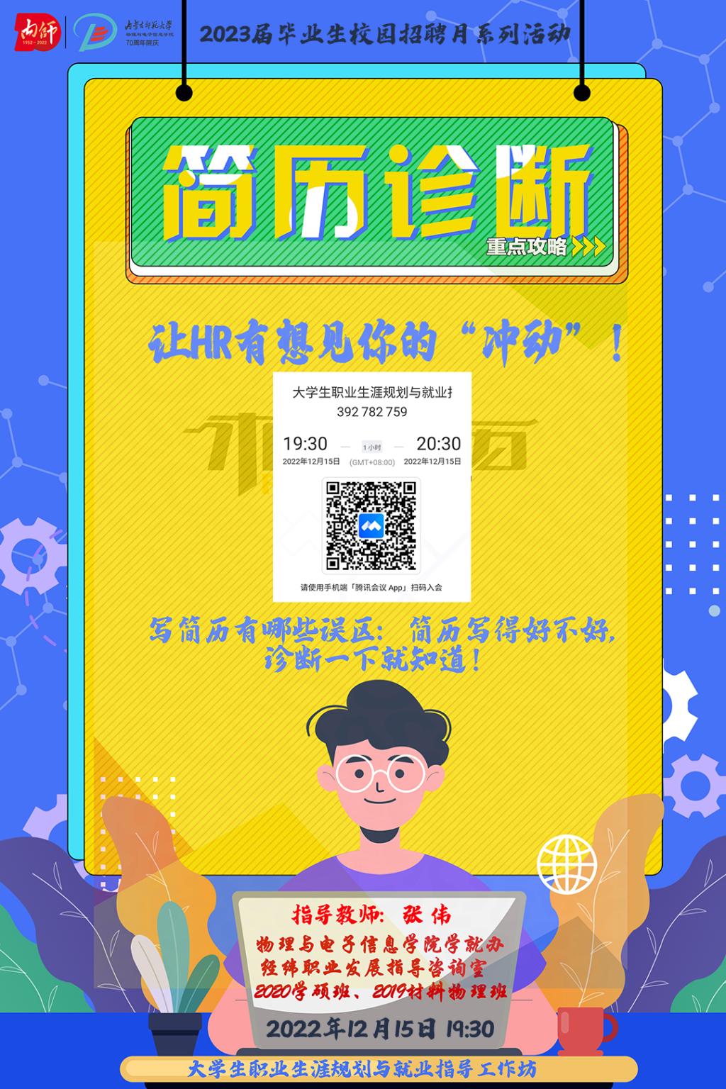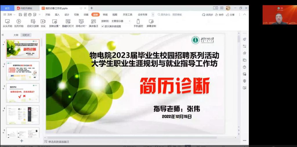 大学生职业生涯规划与就业指导工作坊于2022年12月15日开展了简历诊断活动,经纬职业发展指导咨询室导师、学院党委副书记、副院长张伟老师为2020学硕班、2019材料物理班毕业班提供简历诊断服务。