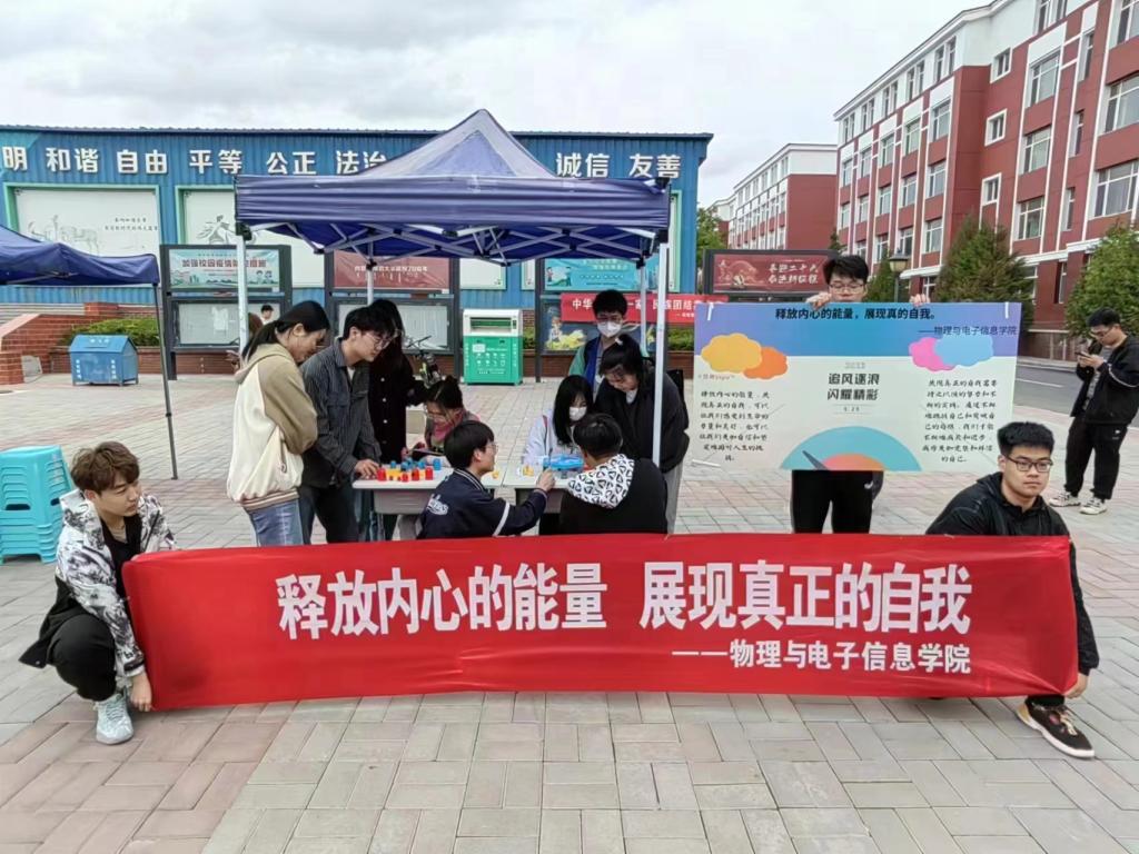 现场的工作人员负责讲解游戏玩法并宣传“5.25”大学生心理健康日。