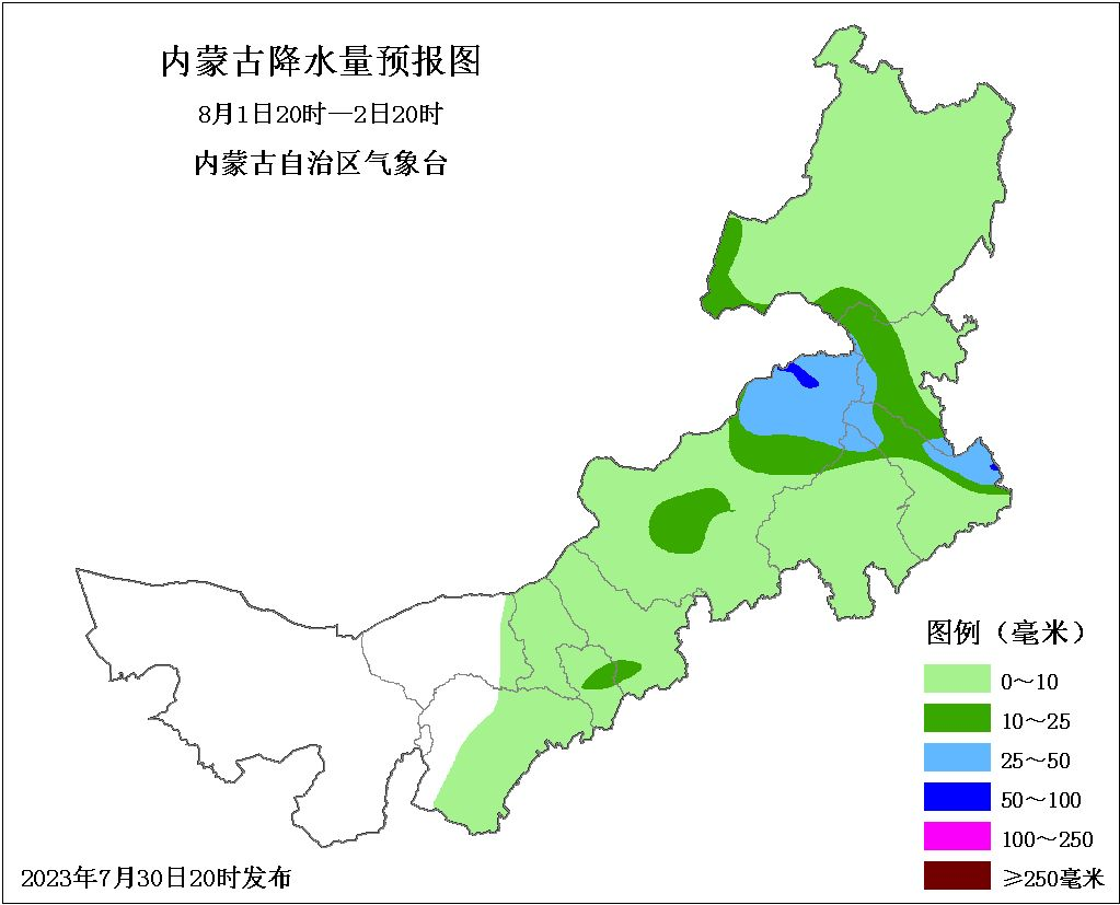 ↑↑↑ 8月1日20时至2日20时,预计呼和浩特市中部、乌兰察布市西南部、锡林郭勒盟中部和东北部、赤峰市北部、通辽市东部和北部、兴安盟西部和南部、呼伦贝尔市西部有中雨,锡林郭勒盟东北部、赤峰市北部、通辽市西北部和东南部有大雨,局地有暴雨。