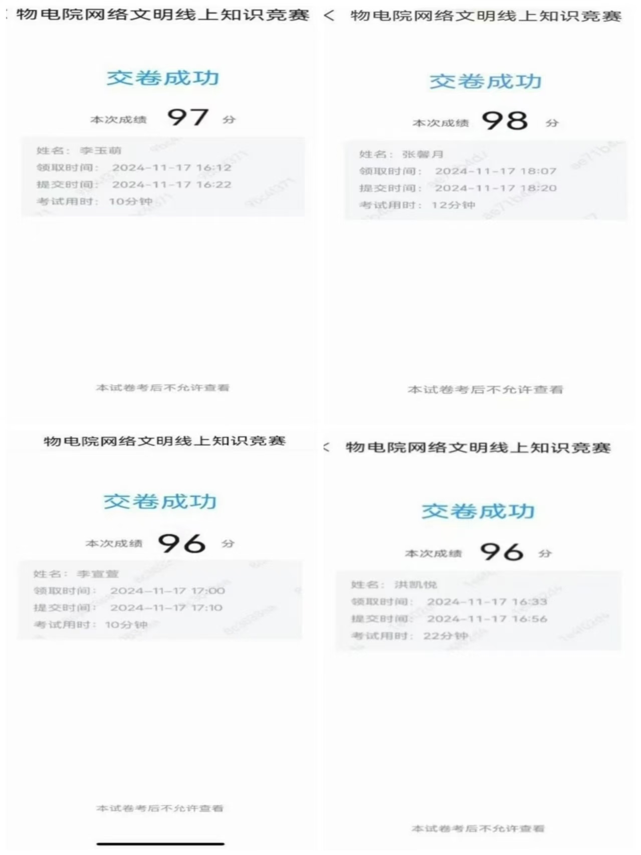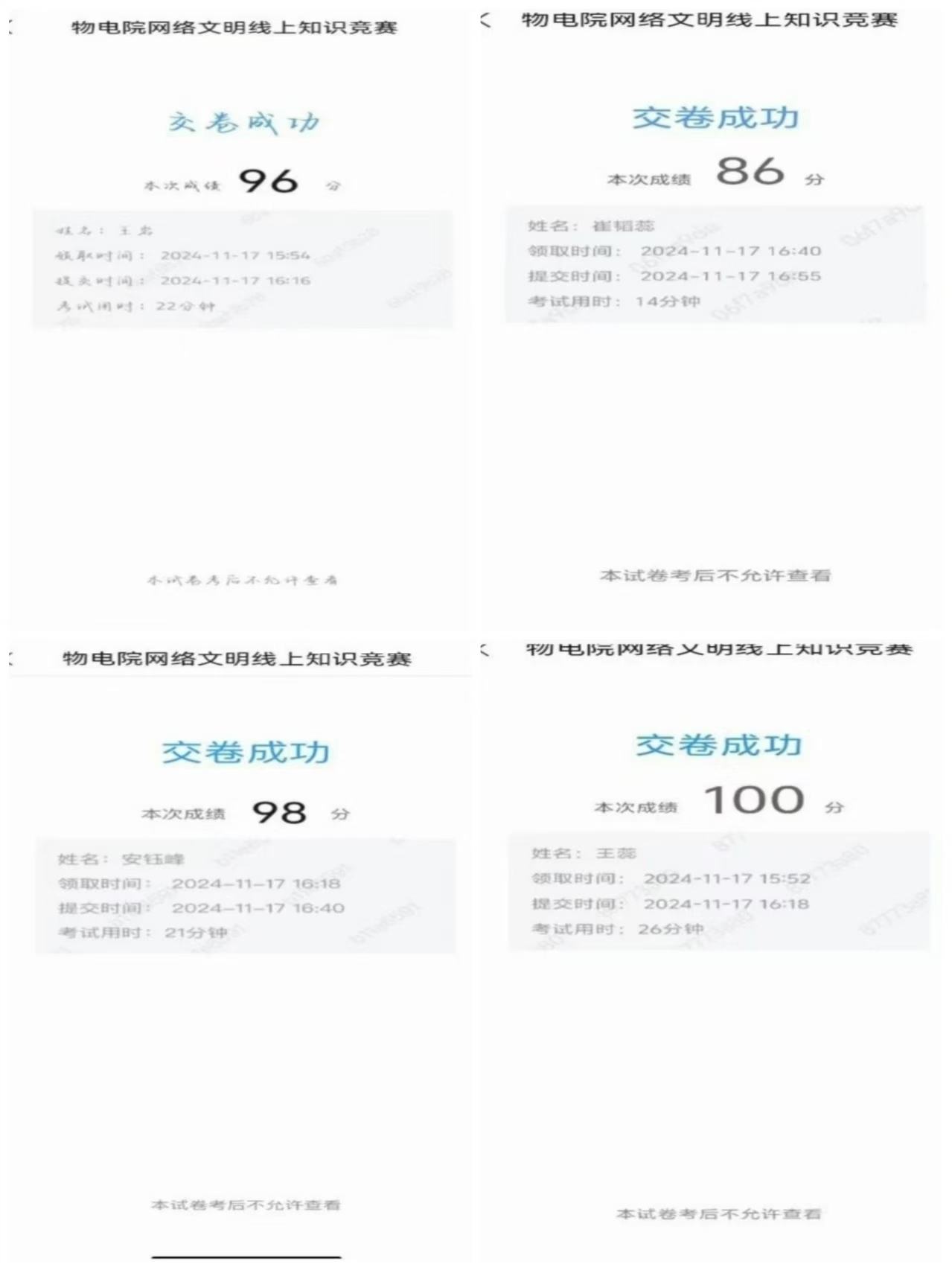 近300名同学参与,同学们利用自己所了解的网络知识认真作答竞赛题目,以赛促学,拓展了网络文明知识面,激发了网络责任感,引导同学们正确使用互联网资源,推动大家积极参与文明网络空间的维护,防范网络诈骗和不良信息的侵害,共造互联网清朗环境,为新时代高质量网络环境创设贡献自己的力量。