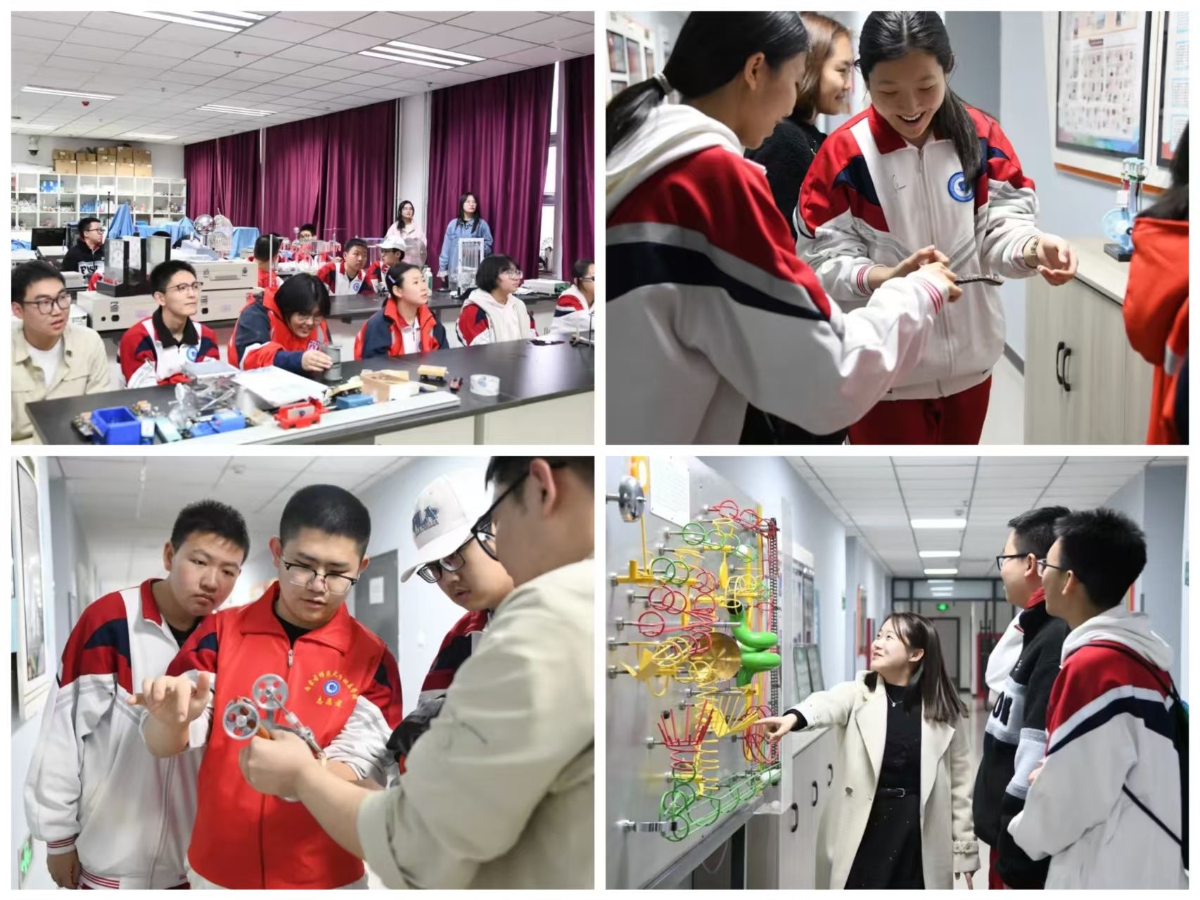 活动中,学院中小学生科普研学教育基地的志愿者们使用通俗易懂的语言,在科普讲解的过程中以科学知识为主导,交互体验为手段,通过有趣的实验活动,充分激发了孩子们的好奇心和求知欲。在教法实验室,志愿者们以中小学生物理(科学)学科知识为起点,展示了一批厂制实验仪器,同时将部分仪器进行自制创新,引导受众体会物理实验仪器与日常生活用品之间的区别与联系,感受奇妙的物理现象。同时还结合诸多实验仪器,向受众传达了自制教具的理念以及创新方法,引领受众从思维角度进入物理世界。在实践与创新工作室,同学们身临其境,体验机器人为生活带来的便利。