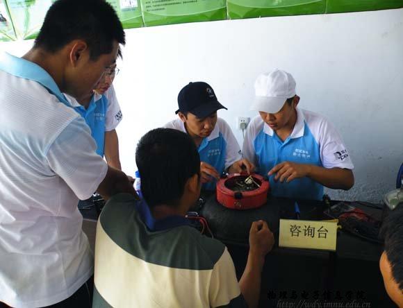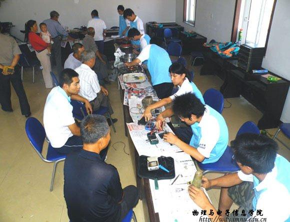 等一百多件。由于电冰箱、抛物面天线等部分电器不易移动,志愿者们就主动到村民家中进行维修、调试。当看到各位村民满意地拿着修好的电器离开时,志愿者们早已将劳累忘记,面带着微笑继续工作,他们热情的态度和精湛的技术赢得了当地农民群众的热烈欢迎。