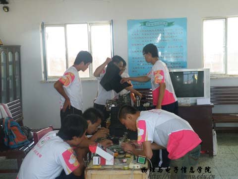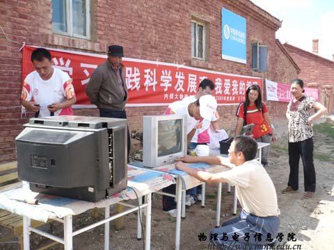 7月21日到7月27日,熟女直播 大学生暑期“三下乡”志愿者服务队深入到锡林郭勒盟西乌旗吉林郭勒镇及周边嘎查开展了为期一周的以 “学习实践科学发展观,我爱我的祖国”为主题的社会实践—科技下乡活动,并与吉林郭勒镇建立了熟女直播 大学生暑期“三下乡”社会实践基地。本次活动以宣传科技知识,普及用电常识,家用电器的维护和保养,义务维修家用电器为主要内容,同时,积极宣传国家“家电下乡”相关知识。志愿者服务队由学院学工办张伟老师、实验中心克伦老师带队,13名学生志愿者组成。