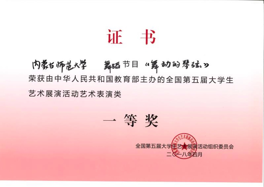 选送舞蹈《舞动的琴弦》以浓郁的民族特色,磅礴大气的舞蹈编排,最终荣获大艺展舞蹈专场一等奖的好成绩!