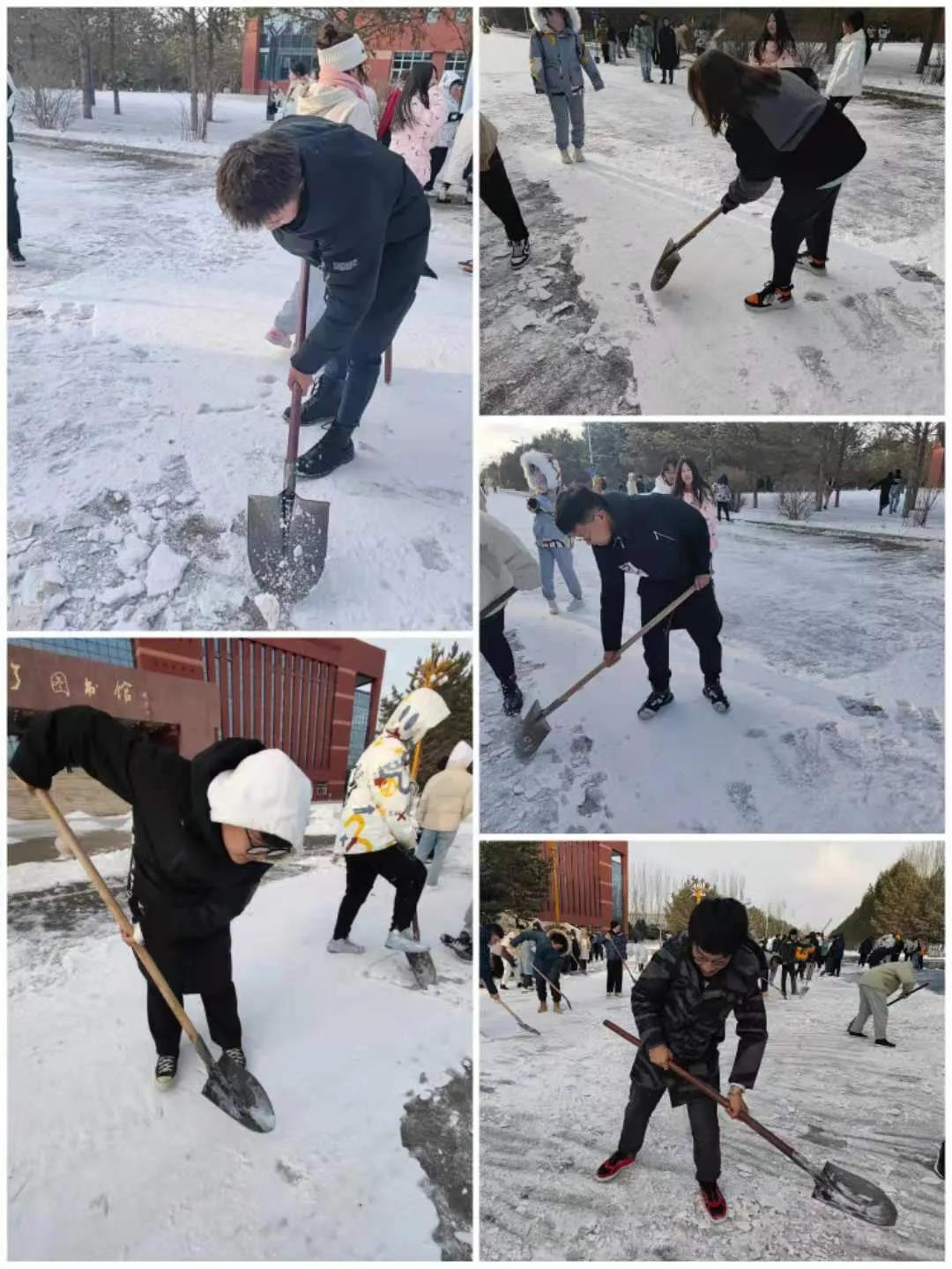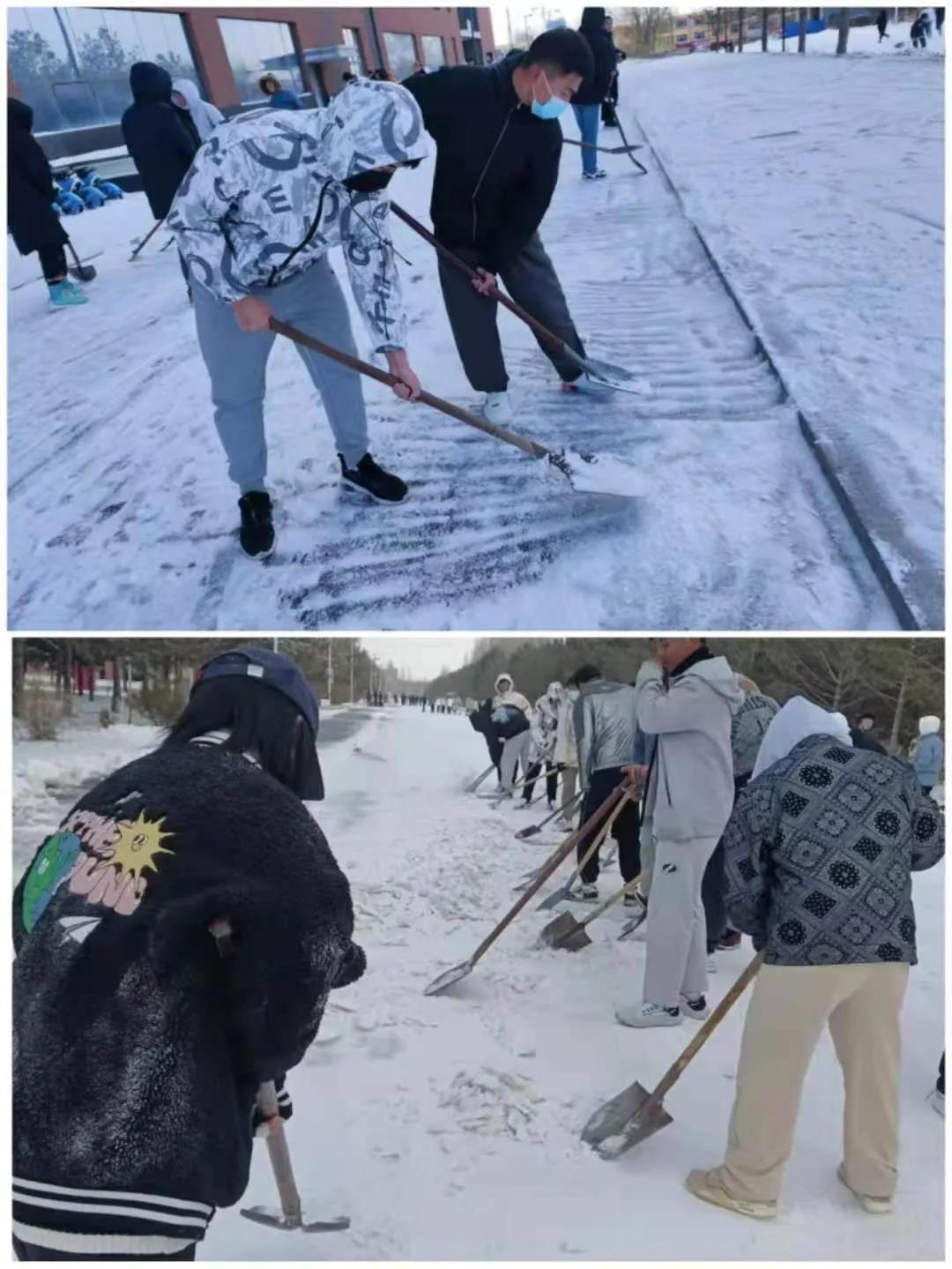 同学们个个精神饱满、干劲十足、分工有序。迎着凛冽的寒风,挥舞着长长的铁锹,宽宽的扫帚,上下翻飞。