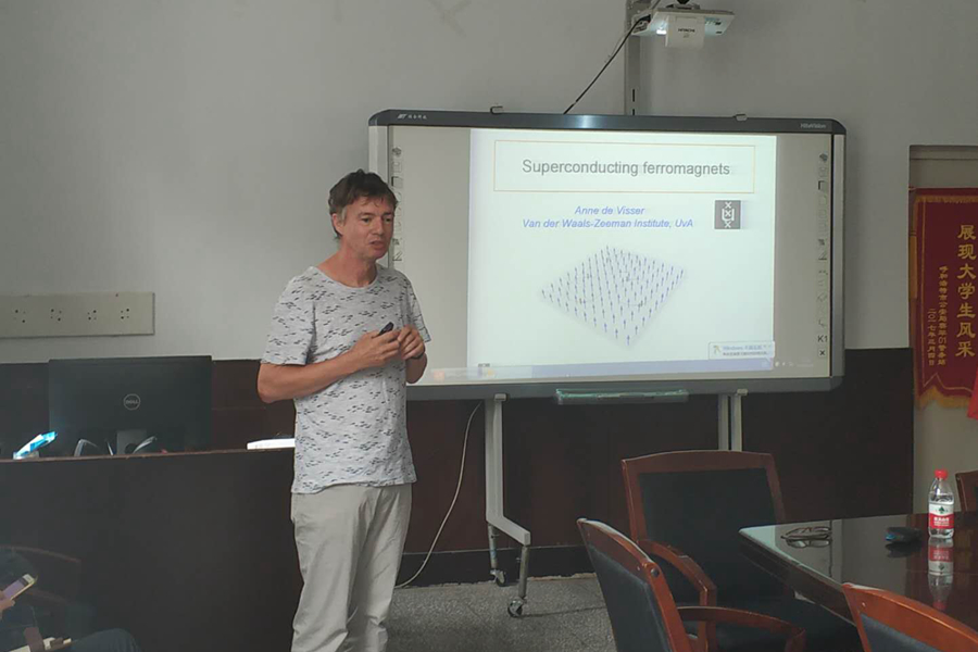 Anne de Visser教授首先介绍了超导材料的发展历史及其研究团队情况,然后重点介绍了本团队目前研究的UCoGe, UGe2等超导材料在外界压力和外加磁场下超导态的变化规律,随后结合量子力学和固体理论对铁磁态和超导态的竞争机理进行了详细的解释,给出了对超导材料的一种全新的认识。最后,Anne de Visser教授与同熟女直播