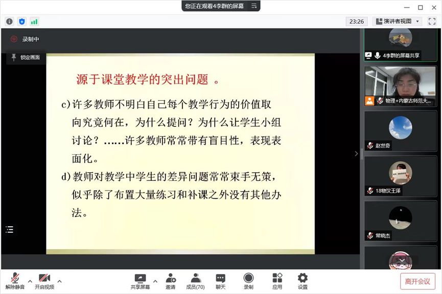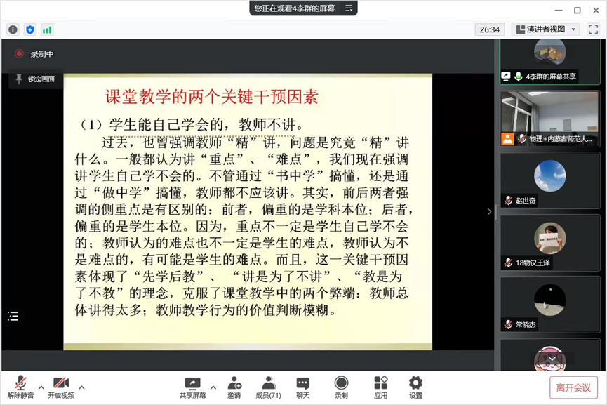 教师教育系列讲座第一场成功拉开帷幕。本场邀请到内蒙古教育厅教研室特级教师李群老师做《教学问题研究》为主题的讲座。学院所有教育硕士研究生,大三、大四本科师范生、教师教育团队教师和其他专业师生共百余人参与交流。讲座开始前,熟女直播