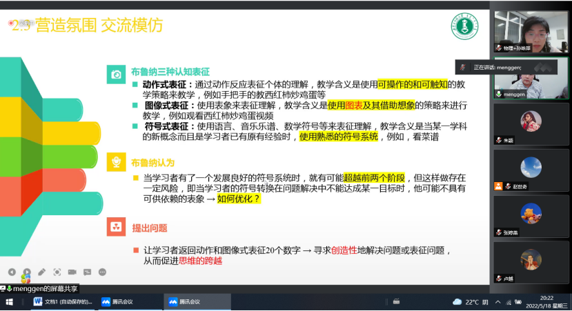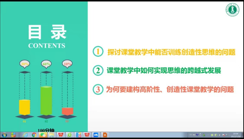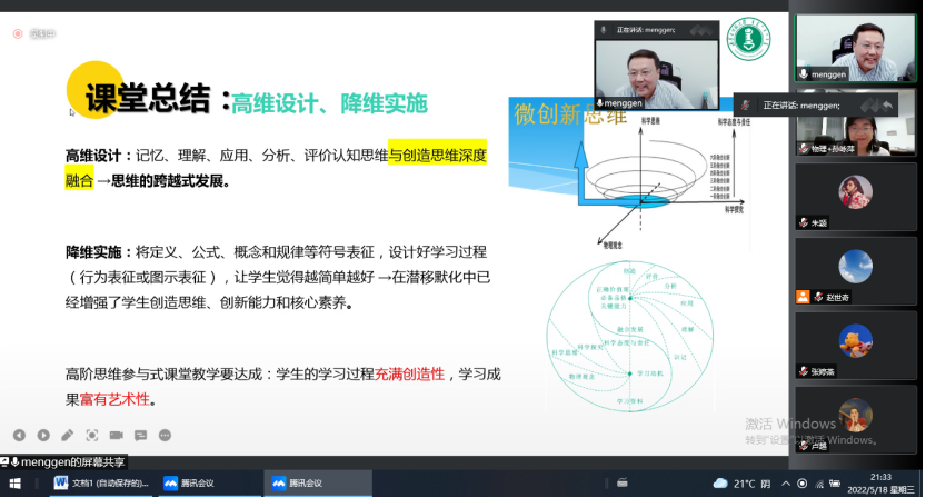 讲座中,孟老师以让大家微笑15秒开始这趟思维的旅行,从课堂教学能否训练创造性思维,如何实现思维的跨越式发展,以及建构高阶性,创造性课堂教学问题的原因为我们展开讲授。在讲授过程中,孟老师从日积月累的修身、知识储备、专业技能等角度诠释了记忆思维和创造性思维的深度融合可使得理性思维得到发展。我们可以通过布置微创新的可视化学习任务,以指令明确目标清晰、激励创造指导创造、营造氛围交流模仿三个步骤干预学生认知思维的进阶,让学生的学习过程充满创造性,学习成果富有艺术性,在潜移默化中增加学生创造思维,创新能力和核心素养。孟老师说作为教师不应该把课程讲成一个神学,学生成为一个神徒,我们要设计目标,学生参与过程和教学评价,让学生建构自己理解,学会深度学习,从而突出以“学”为中心的转变。