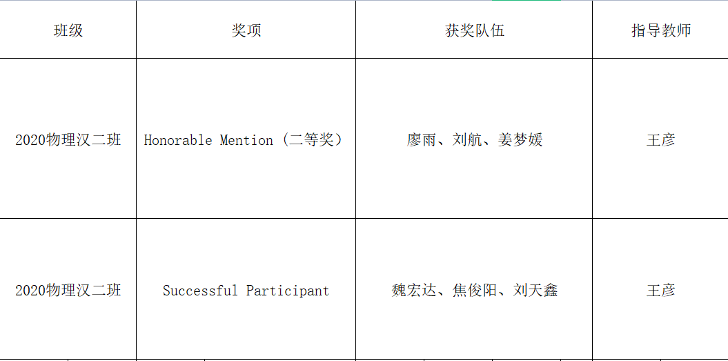 王彦老师带领的的2支队伍参加比赛并荣获佳绩,其中1支队伍荣获2022年美国大学生数学建模竞赛二等奖(Honorable Mention),另外1支队伍荣获成功参赛奖(Successful Participant)。