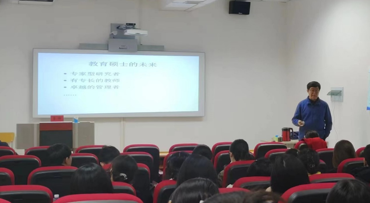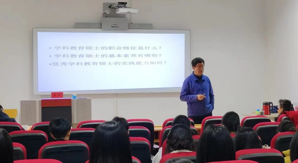李群老师围绕“学科教育硕士的职业特征是什么、学科教育硕士的基本素养有哪些、优秀学科教育硕士的实践能力如何”三方面展详细阐释了作为一名现代教育硕士需要发展的标准和方向。