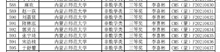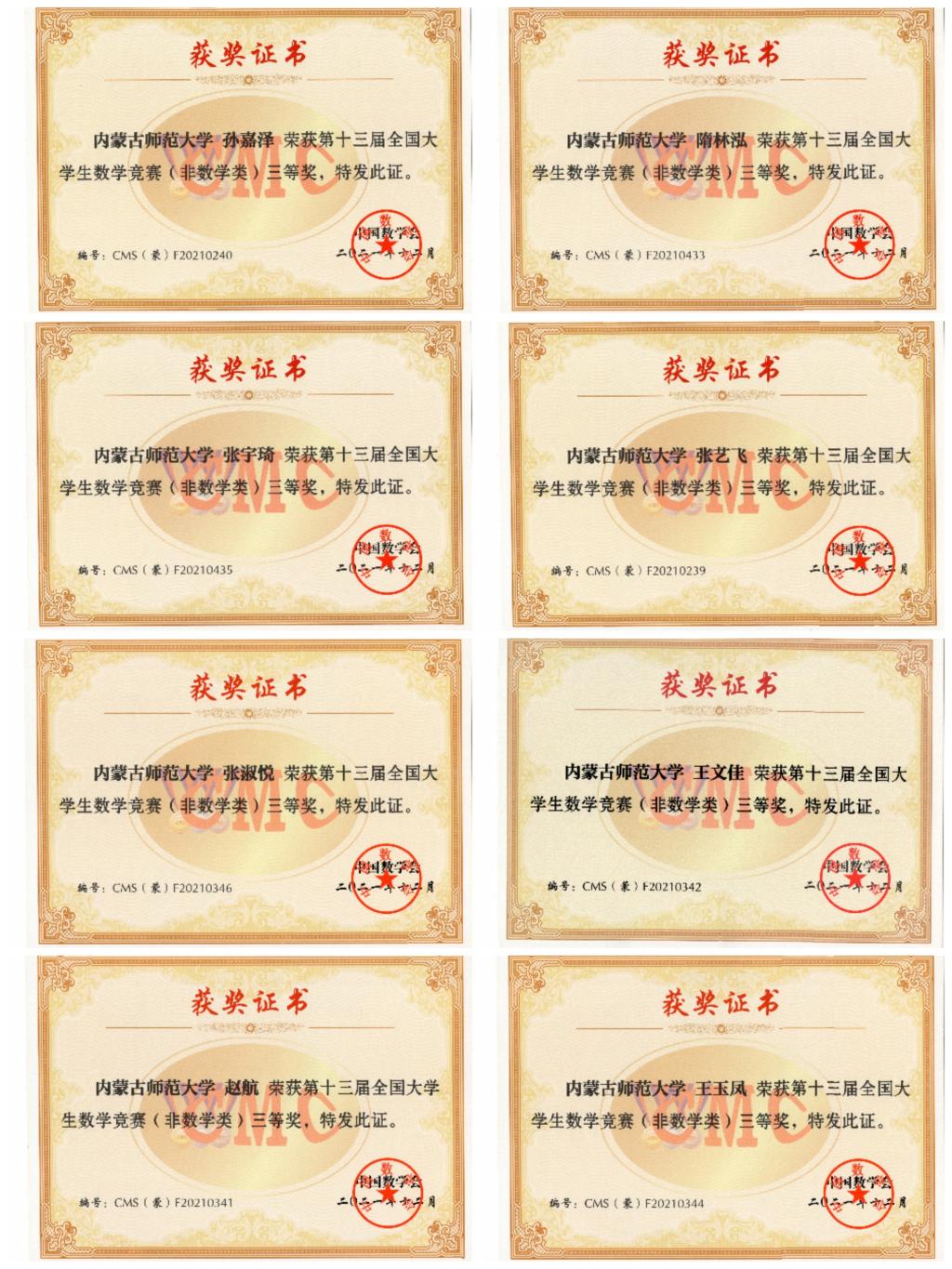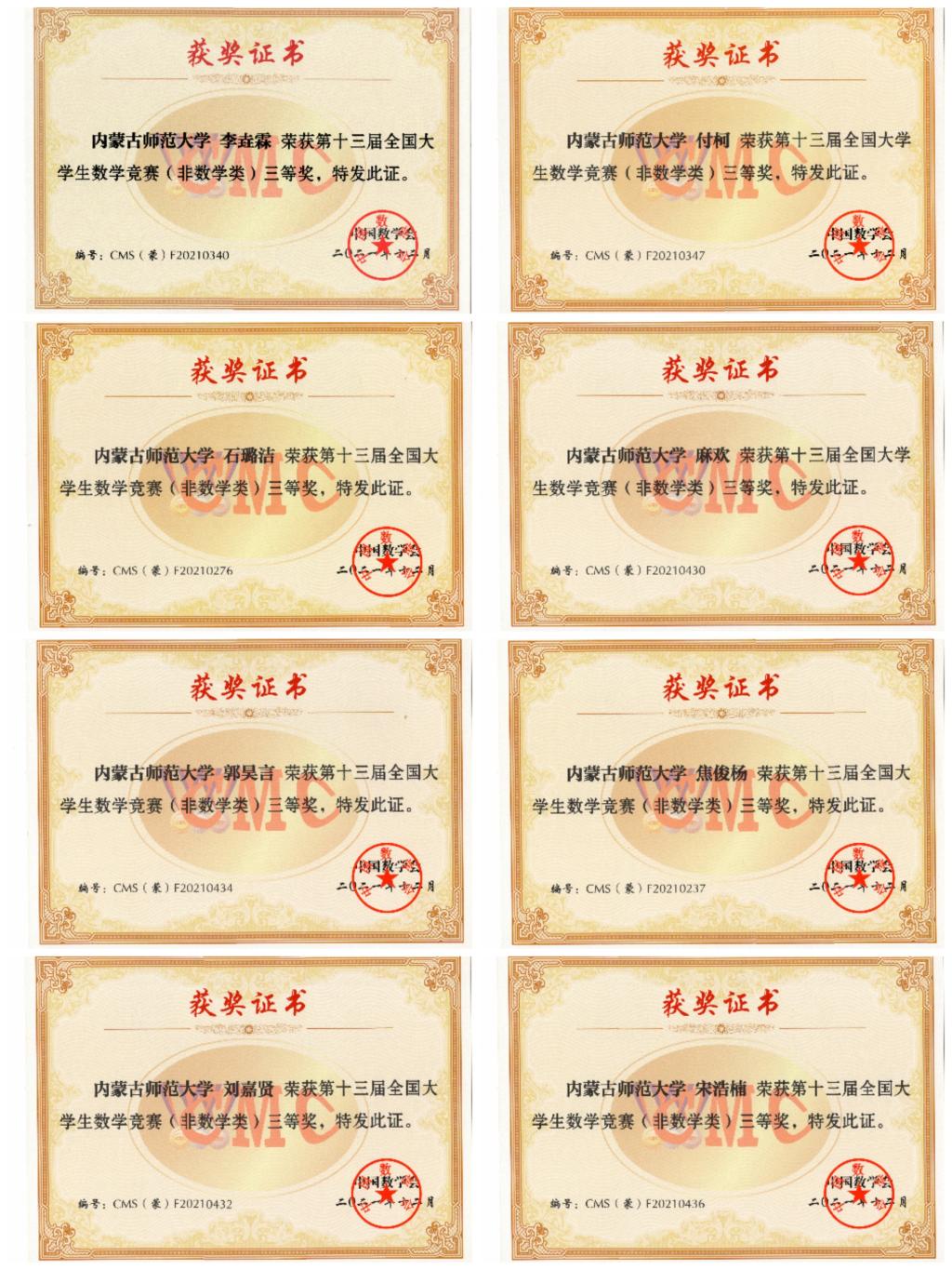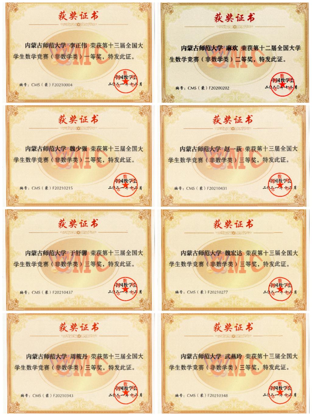第十三届全国大学生数学竞赛初赛于2021年11月举行,熟女直播 付柯、郭昊言、焦俊杨、李垚霖、李正伟、刘嘉贤、麻欢、石璐洁、宋浩楠、隋林泓、孙嘉泽、王文佳、王玉凤、魏宏达、魏少强、武燕玲、于舒馨、张淑悦、张艺飞、张宇琦、赵航、赵一荻、周筱丹(排名不分先后)23名同学分别获得内蒙古自治区一等奖、二等奖、三等奖。