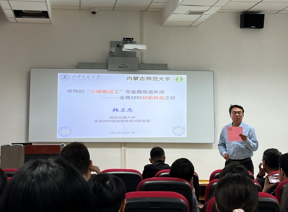 时空大讲堂,以《懒惰的“小螺搬运工”与金属低温失效——金属材料韧脆转变之谜》为题做了一场精彩报告。报告由学院副院长那日苏教授主持,学院相关专业老师及研究生到场聆听。